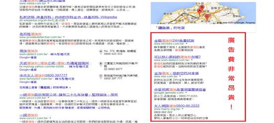 以下截取自Google&YAHOO搜尋關鍵字”徵信社”的結果,紅色框起來的部份就是刊登徵信社廣告的徵信公司,可想而知這些徵信社收費肯定不便宜!