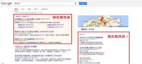 天啊!那消費者要如何找到收費合理又會誠信辦案的徵信社?台灣徵信社服務網建議先從成本考量著手,只要徵信社承辦業務人員有合理的利潤,自然就會認真辦案了。先收集徵信社開銷較低的業者,徵信社、徵信公司名單收集可從搜尋引擎著手。YAHOO名單跟GOOGLE名單比對,兩個搜尋引擎付費廣告都有刊登廣告的徵信社列為第二順位,將自然排序的徵信社名單列為第一順位諮詢的對象並以他們的開價為基準,多諮詢幾家徵信社。因為關鍵字「徵信社」、「徵信公司」自然排序即使請專業的關鍵字優化公司服務所花費的廣告費會比付費廣告便宜許多,「徵信社」、「徵信公司」自然排序有排名的徵信社會較愛惜羽毛,因為亂搞也會遭到網路輿論的抨擊。